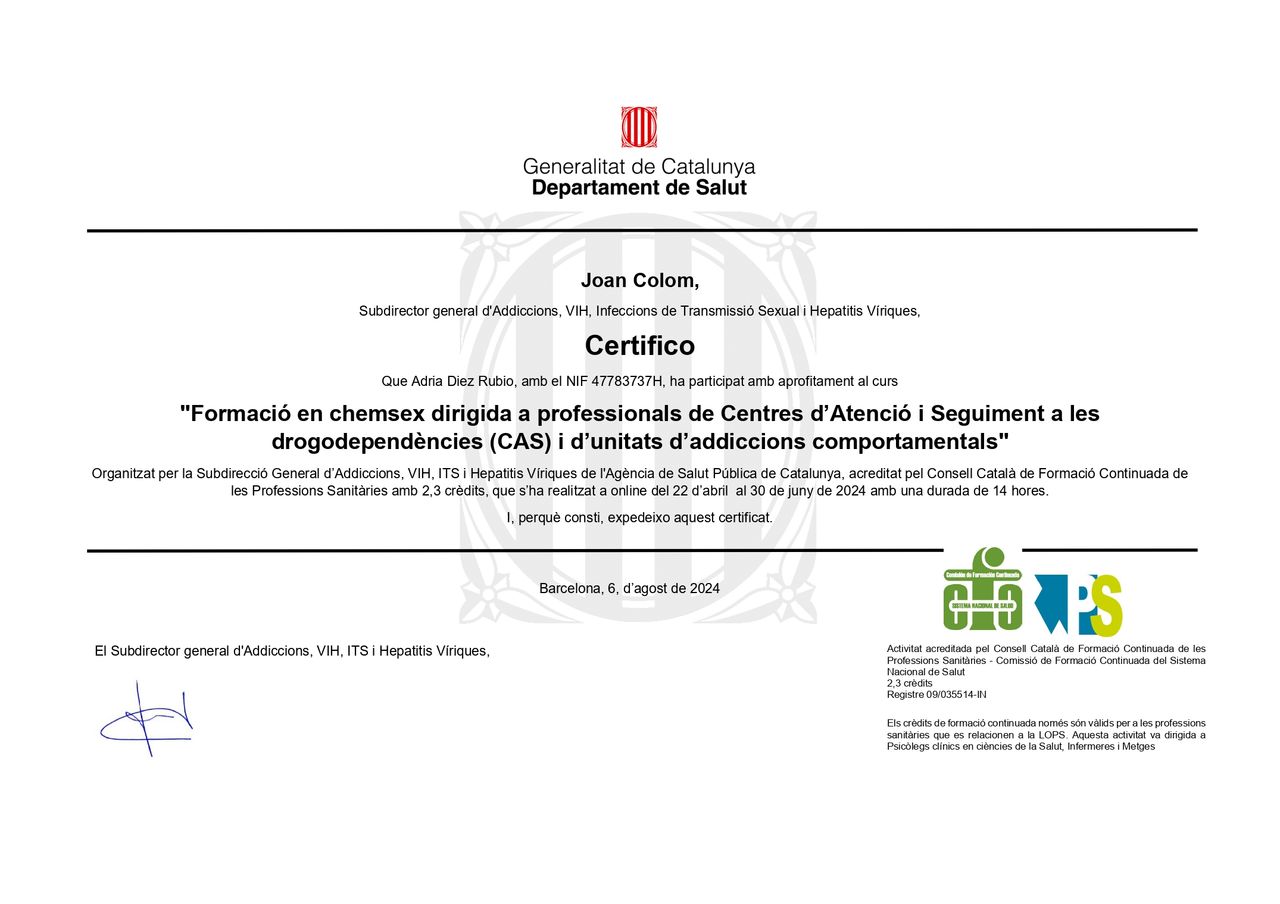 ¿Cuáles son las principales especialidades de Adrià Díez Rubio?Adrià Díez Rubio es psicólogo. Te mostramos algunos de los servicios que ofrece gracias a su trayectoria y amplia experiencia: Primera visita Psicología, Terapia psicológica, Psicoterapia individual, Gestión de la ansiedad, Terapia para la depresión, Terapia de duelo, Tratamiento para miedos, Terapia para el perfeccionismo, Gestión del estrés, Estrés laboral y conciliación familiar.