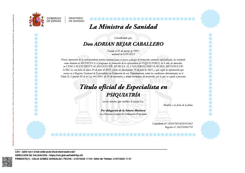 ¿Cuáles son las principales especialidades de Adrián Bejar Caballero?Adrián Bejar Caballero es psiquiatra. Te mostramos algunos de los servicios que ofrece gracias a su trayectoria y amplia experiencia: Primera visita Psiquiatría, Consulta de revisión.