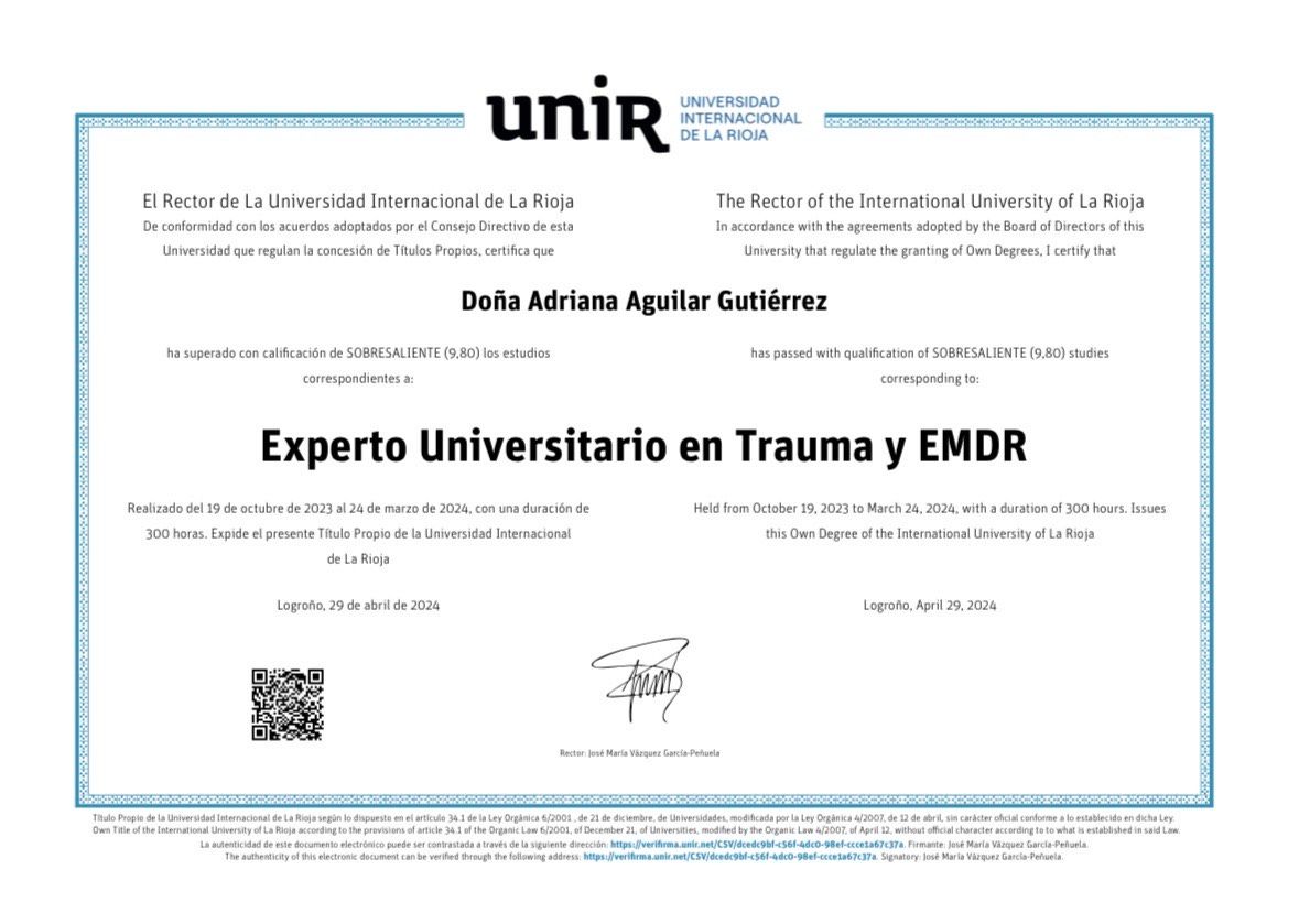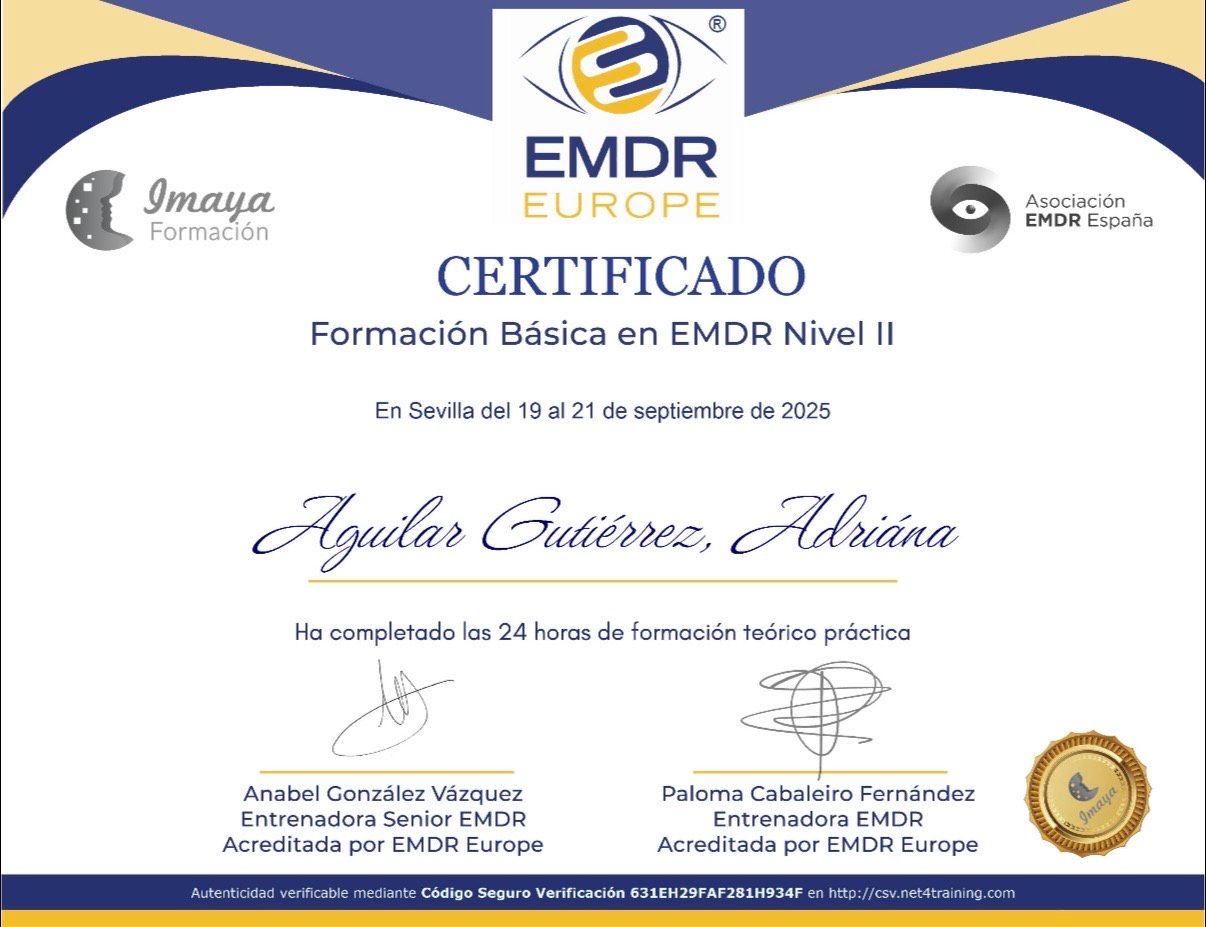 Psicóloga General Sanitaria, colegiada en el Colegio Oficial de Psicología de Andalucía Occidental (AN-13444). Especialista en terapia EMDR acreditada por la Asociación Española de EMDR.