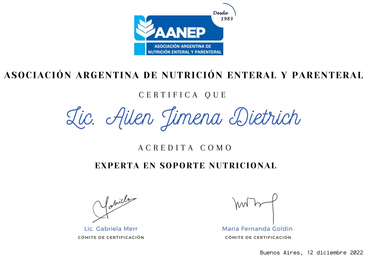 Cuento con amplia experiencia en soporte nutricional: suplementación oral, nutrición enteral y nutrición parenteral, asistiendo a pacientes ambulatorios y domiciliarios, realizando valoración, diagnóstico nutricional, seguimiento y planificación terapéutica.