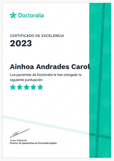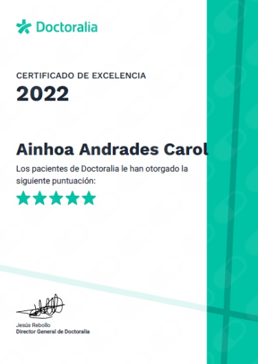 ¿Puedo hacer la visita con Ainhoa Andrades Carol de forma online, sin tener que desplazarme hasta su consulta?Sí, Ainhoa Andrades Carol ofrece consulta de forma remota. Solo tienes que seleccionar "consulta online" cuando vayas a reservar cita desde el calendario, y así podrás ver las fechas y horas disponibles.