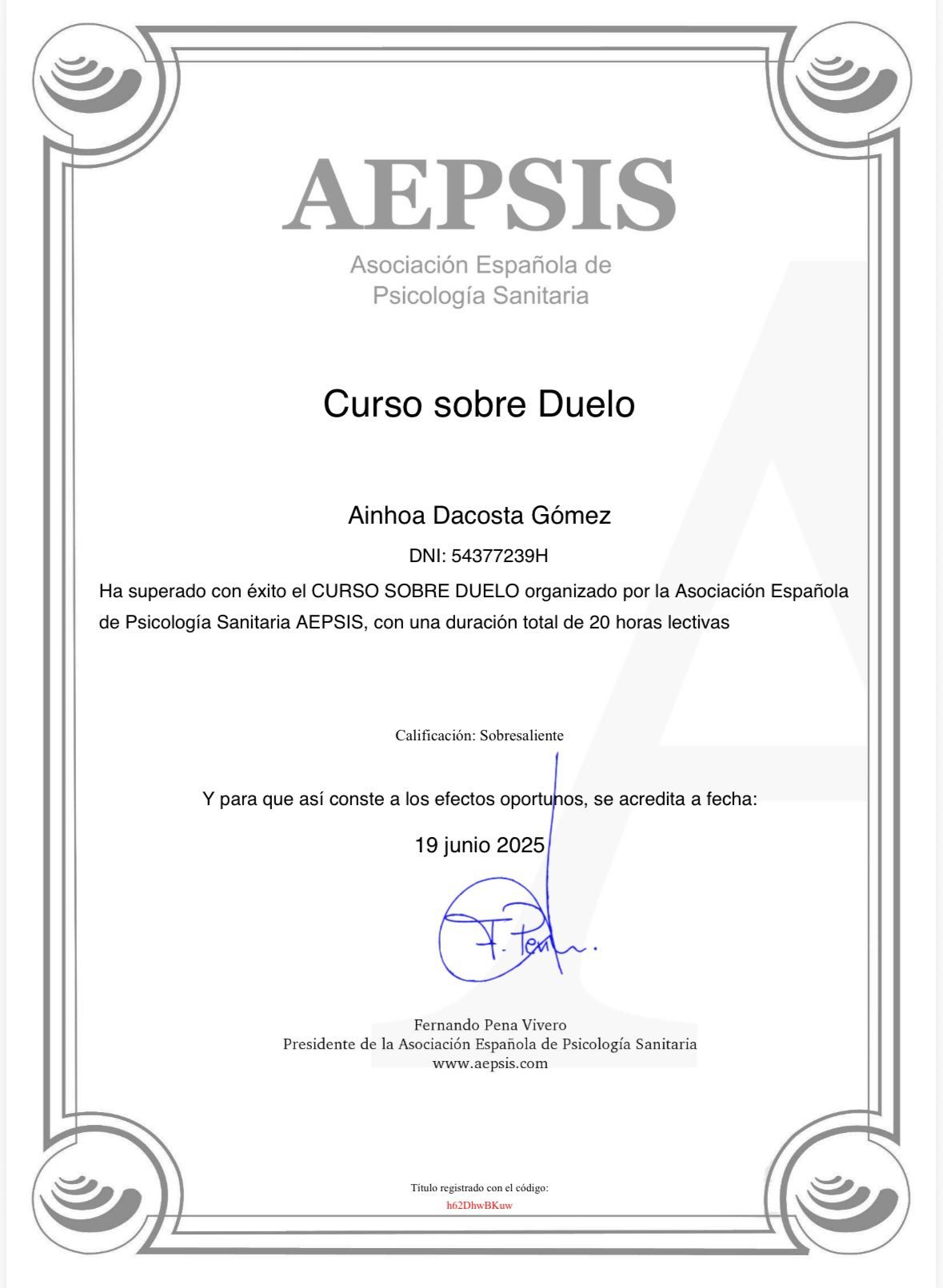 ¿Cuáles son las principales especialidades de Ainhoa Dacosta Gómez?Ainhoa Dacosta Gómez es psicóloga. Te mostramos algunos de los servicios que ofrece gracias a su trayectoria y amplia experiencia: Psicoterapia.