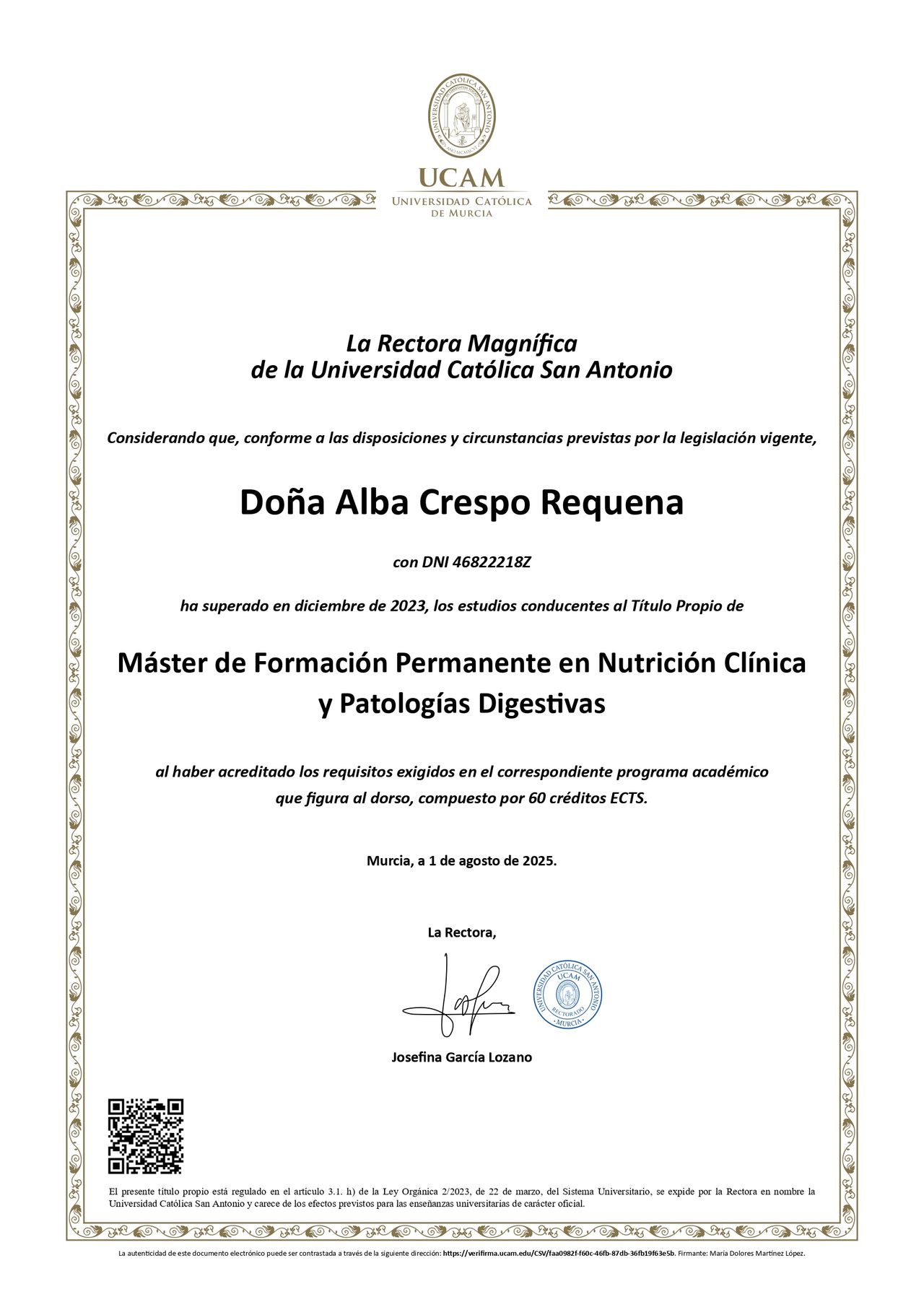 ¿Cuáles son las principales especialidades de Alba Crespo Requena?Alba Crespo Requena es dietista nutricionista. Te mostramos algunos de los servicios que ofrece gracias a su trayectoria y amplia experiencia: Seguimiento online, Primera visita online, Primera consulta presencial, Tratamiento para trastornos hormonales, Tratamiento para trastornos de conducta alimentaria, Nutrición deportiva, Seguimiento nutrición clínica, Nutrición Integrativa, Seguimientos patología digestiva, Tratamiento para trastornos digestivos y estudio de microbiota.