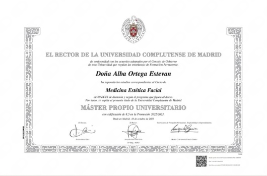 Master en Medicina Estética por la Universidad Complutense de Madrid.