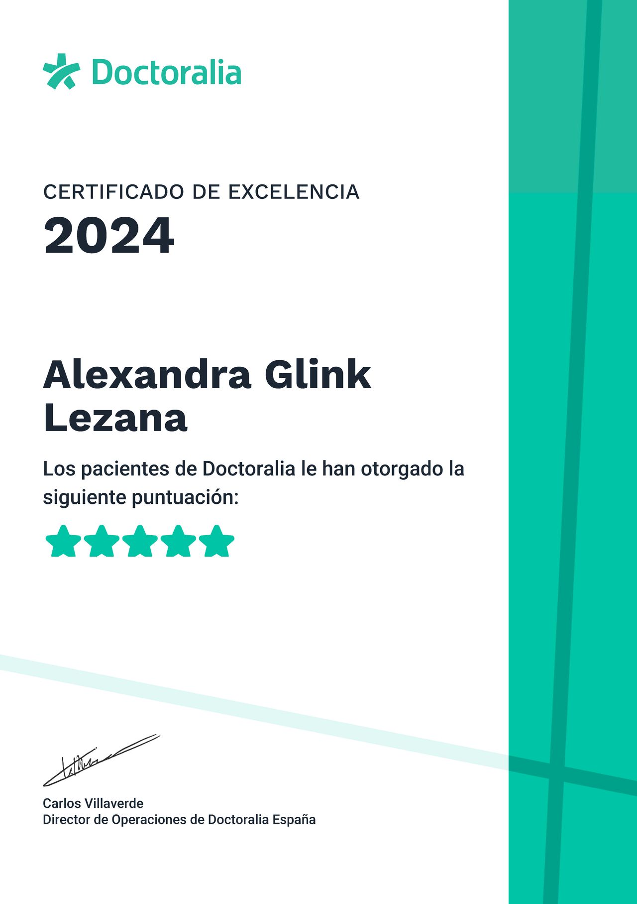¿Qué opinan los pacientes de Alexandra Glink Lezana?Un total de 139 pacientes han querido dejar una opinión sincera y real sobre Alexandra Glink Lezana, otorgándole además una valoración media de 5 estrellas (sobre un máximo de 5).