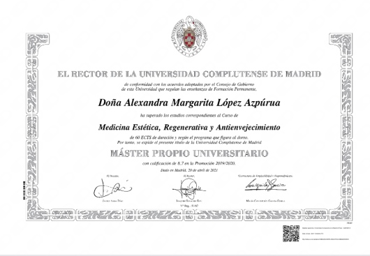 •Máster Medicina Estética y Antienvejecimiento. Universidad Complutense de Madrid
