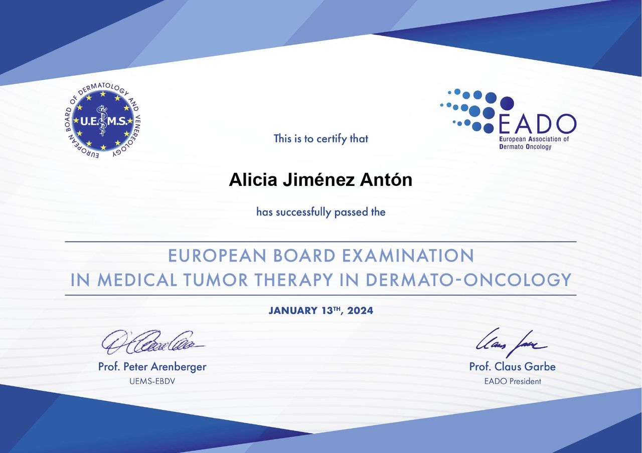 ¡Hola a todos! Soy la doctora Alicia Jiménez Antón, especialista en Dermatología Médico-Quirúrgica y Venereología vía MIR. Realicé mi formación en dermatología en el Hospital Universitario Puerta del Mar de Cádiz, donde actualmente centro mi actividad en la Dermatología Pediátrica y el Cáncer de Piel. He realizado un máster de formación específica en dermatología pediátrica y obtuve el título que ofrece la Asociación Europea de Dermato-Oncología (EADO) para dermatólogos con amplia formación en cáncer de piel.