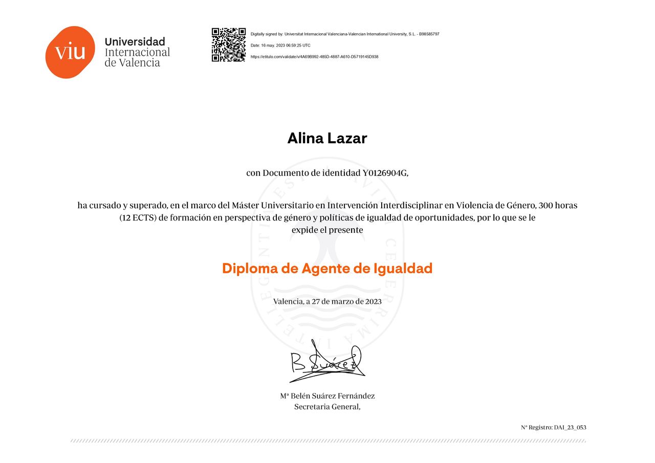 Alina Lazar Cazan es psicóloga. Te mostramos algunos de los servicios que ofrece gracias a su trayectoria y amplia experiencia: Asistencia psicológica a mujeres víctimas de violencia de género, Tratamiento de los trastornos de ansiedad, Tratamiento para víctimas de bullying, Primera visita Psicología, Terapia de pareja, Terapia cognitivo-conductual, Terapia sexual, Terapia con EMDR, Terapia familiar, Diagnóstico y atención de las altas capacidades.