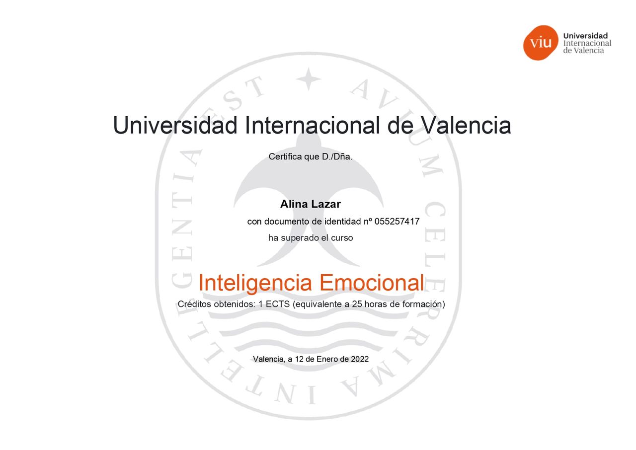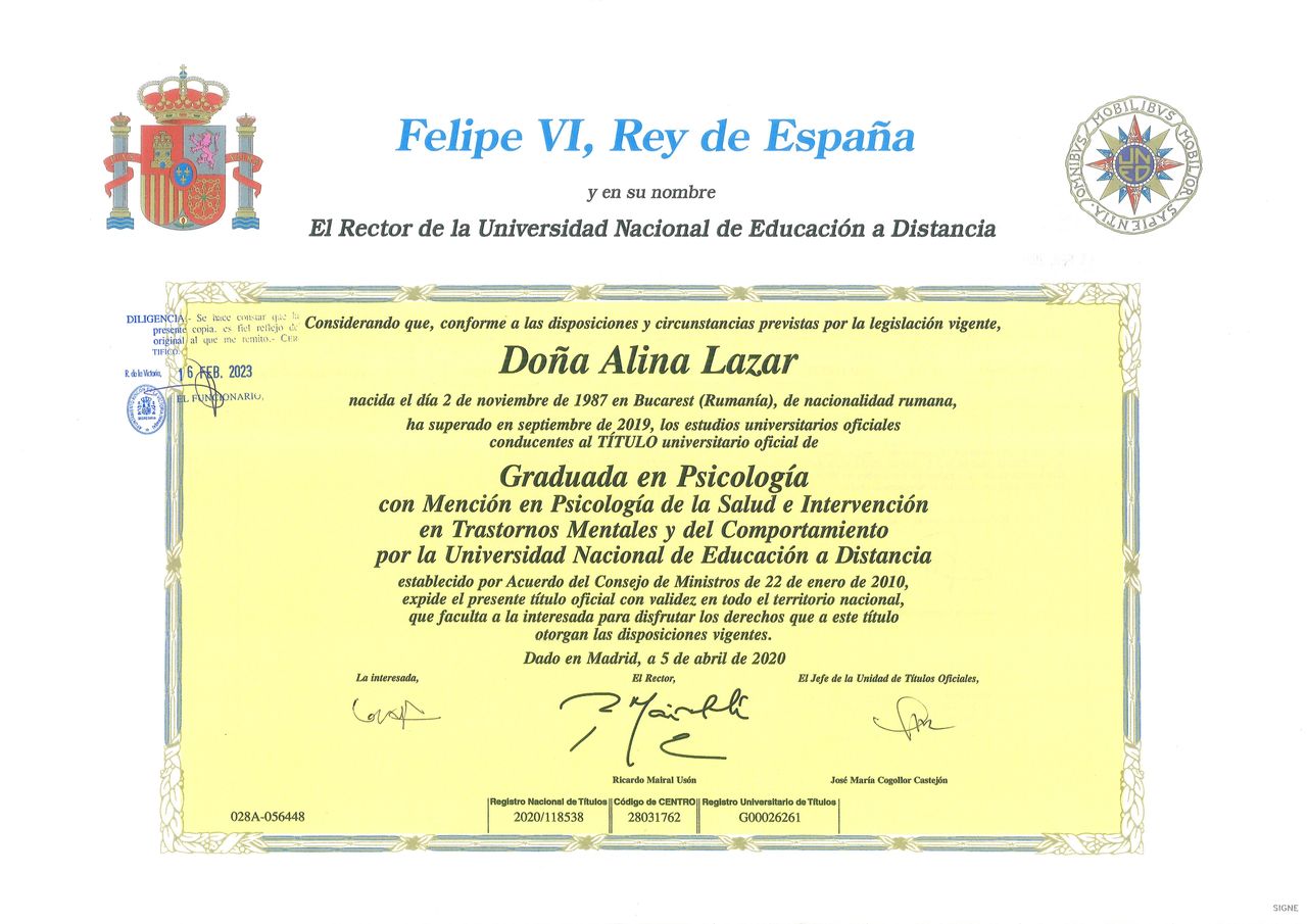 Alina es una excelente profesional, muy preparada con una gran vocación, empatía, dedicación y dispocion de ayudar. Además habla varios idiomas perfectamente lo que es una gran ventaja para residentes de otros países. Merece la pena probar sus servicios con una excelente relación calidad-precio.