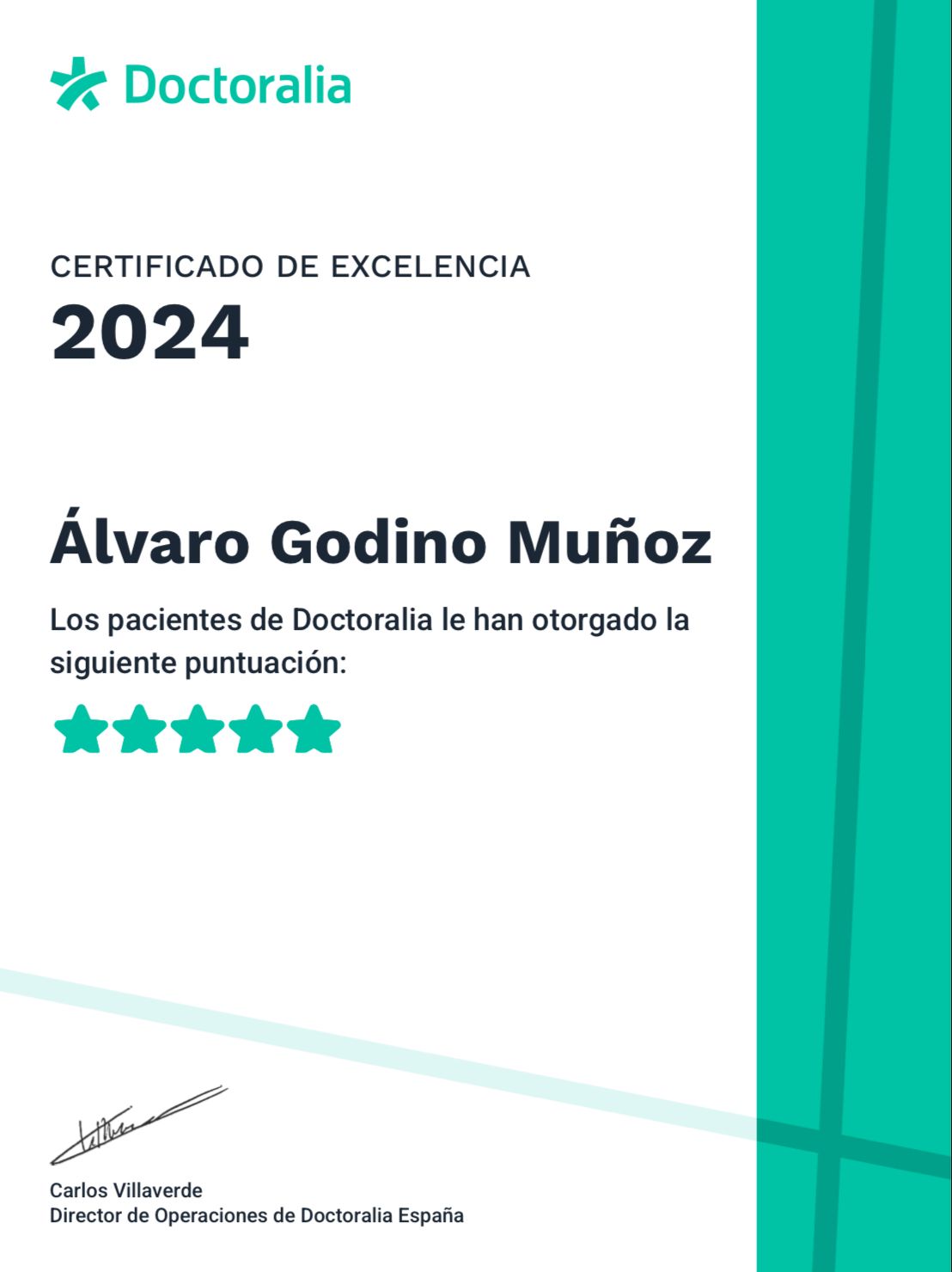 ¿Cómo puedo reservar una cita con Álvaro Godino Muñoz?El calendario que muestra Álvaro Godino Muñoz en Doctoralia está actualizado en tiempo real, por lo que solo tienes que elegir qué día y hora te va mejor de entre las disponibles. La reserva es gratuita, y además recibes un recordatorio antes de la visita.