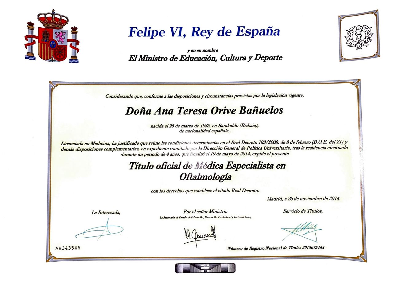 ¿Cuáles son las principales especialidades de Ana Orive Bañuelos?Ana Orive Bañuelos es oftalmóloga. Te mostramos algunos de los servicios que ofrece gracias a su trayectoria y amplia experiencia: Primera visita Oftalmología, Visitas sucesivas Oftalmología, Cirugía refractiva, Tomografía óptica de coherencia (OCT), Implante de lente intraocular, Tonometría, Facoemulsificación de catarata con lente intraocular, Paquimetría, Topografía corneal, Retinografía.