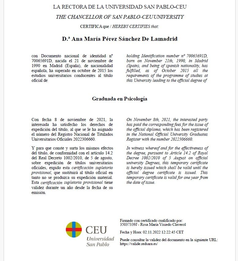 Graduada en Psicología por la Universidad San Pablo CEU.
