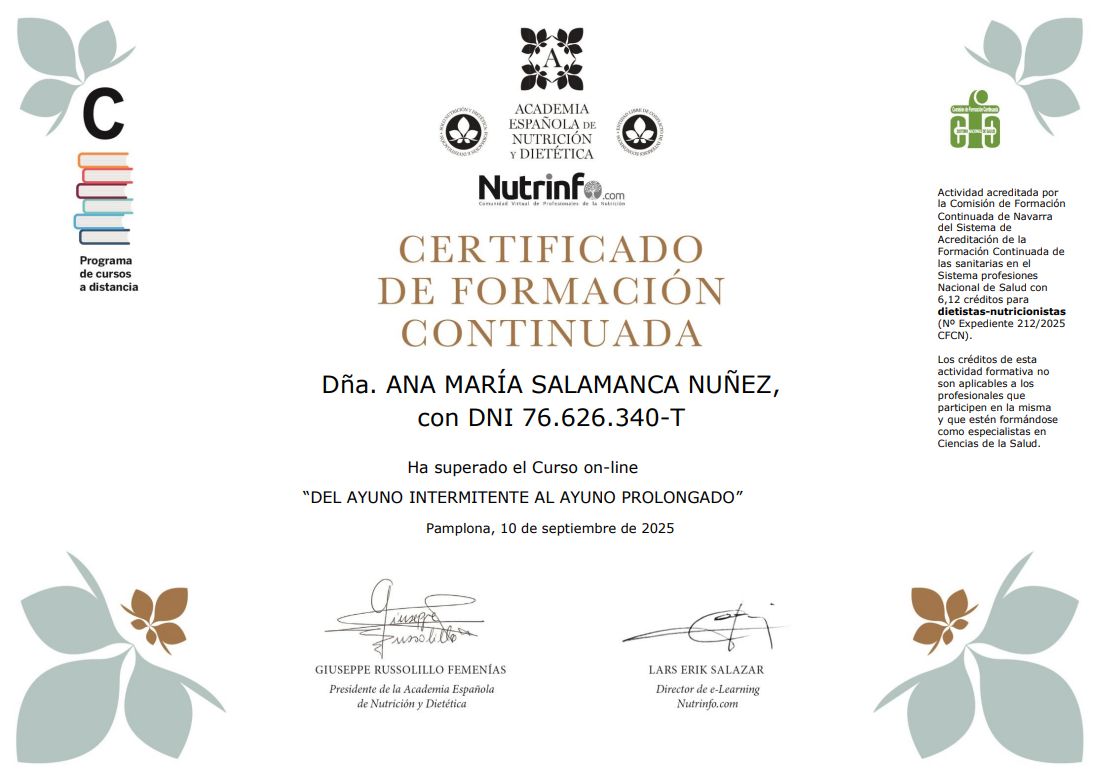 ¿Cuáles son las principales especialidades de Ana Salamanca Nuñez?Ana Salamanca Nuñez es dietista nutricionista. Te mostramos algunos de los servicios que ofrece gracias a su trayectoria y amplia experiencia: Primera visita Nutrición y Dietética, Tratamientos para el sobrepeso y la obesidad, Asesoramiento dietético, Visitas sucesivas Nutrición y Dietética, Dieta personalizada, Dieta para lactancia, Tratamiento de la obesidad infantil, Educación nutricional, Tratamientos para el bajo peso y la desnutrición, Alimentación en la menopausia.