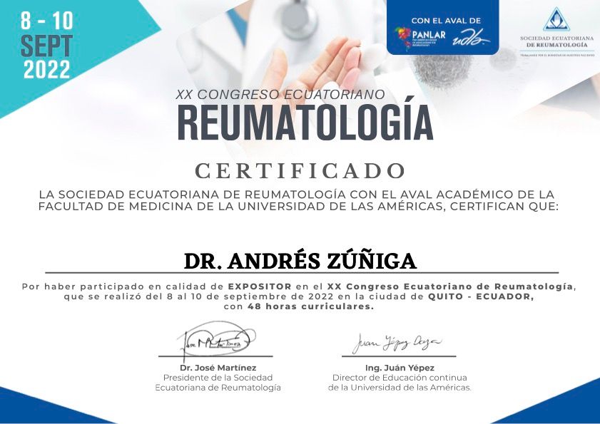 El Dr. Andrés Zúñiga Vera es unmédico especialista en Reumatología, con una sólida trayectoria profesional y una vocación clara por el cuidado integral del paciente. Obtuvo su título de Doctor en Medicina y Cirugía por la Universidad Católica Santiago de Guayaquil de Ecuador en 2006, luego realizó un Máster en Investigación Biomédica en la Universitat Pompeu Fabra y completó la especialidad en Reumatología en el Complejo Hospitalario de Navarra, donde posteriormente trabajó como Médico adjunto.