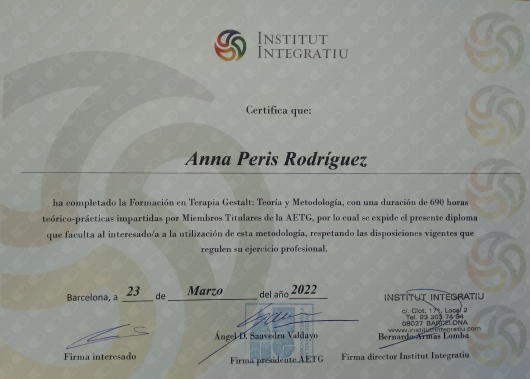 ¿Cuáles son las principales especialidades de Anna Peris Rodriguez?Anna Peris Rodriguez es psicóloga. Te mostramos algunos de los servicios que ofrece gracias a su trayectoria y amplia experiencia: Primera visita Psicología, Acompañamiento en el proceso de duelo, Gestión de la ansiedad, Terapia para la depresión, Desarrollo y crecimiento personal, Estrés laboral y conciliación familiar, Psicoterapia Gestalt, Tratamiento en autoestima, Consulta online, Psicoterapia online (visitas sucesivas).