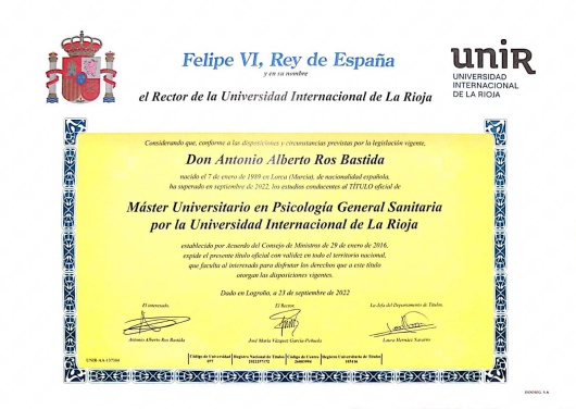 ¿Cuáles son las principales especialidades de Antonio Alberto Ros Bastida?Antonio Alberto Ros Bastida es psicólogo. Te mostramos algunos de los servicios que ofrece gracias a su trayectoria y amplia experiencia: Consulta online, Bienestar personal, Gestión de la ansiedad, Gestión del estrés, Tratamiento para estados depresivos, Primera visita Psicología, Visita Psicología, Consulta de Psicología Sanitaria.