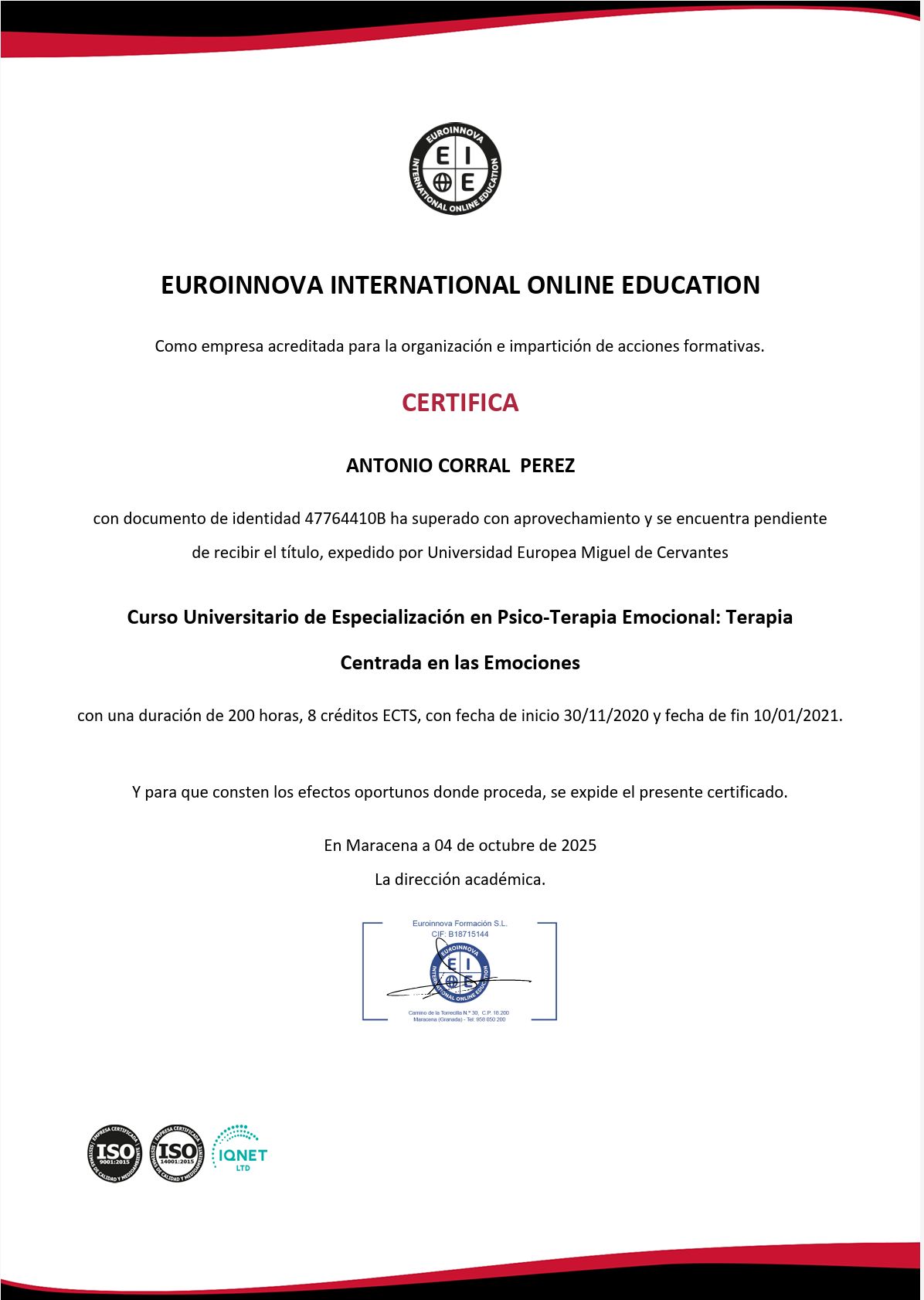 CAT: Hola, sóc l’Antonio Corral Pérez (Col·legiat núm. 35.190), psicòleg especialitzat en Psicologia Sanitària (UOC) i Màster en Psicologia General Sanitària (Universitat Internacional de València). A més, m’he format en Mindfulness, Relaxació, Educació Emocional, Teràpia Emocional i Coaching, cosa que em permet treballar d’una manera integradora, propera i adaptada a cada persona.