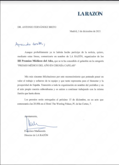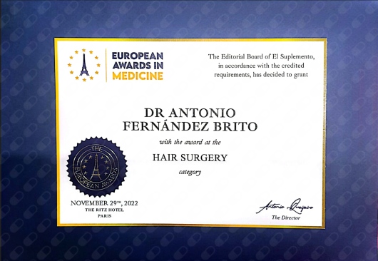 En el 2021 el Dr. Antonio Fernández Brito ha sido premiado por el diario La Razón como el Médico del Año en la especialidad de injerto capilar, en reconocimiento a los más de 500 pacientes intervenidos con éxito.