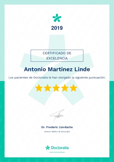 ¿Cómo puedo reservar una cita con Antonio Martinez Linde?El calendario que muestra Antonio Martinez Linde en Doctoralia está actualizado en tiempo real, por lo que solo tienes que elegir qué día y hora te va mejor de entre las disponibles. La reserva es gratuita, y además recibes un recordatorio antes de la visita.