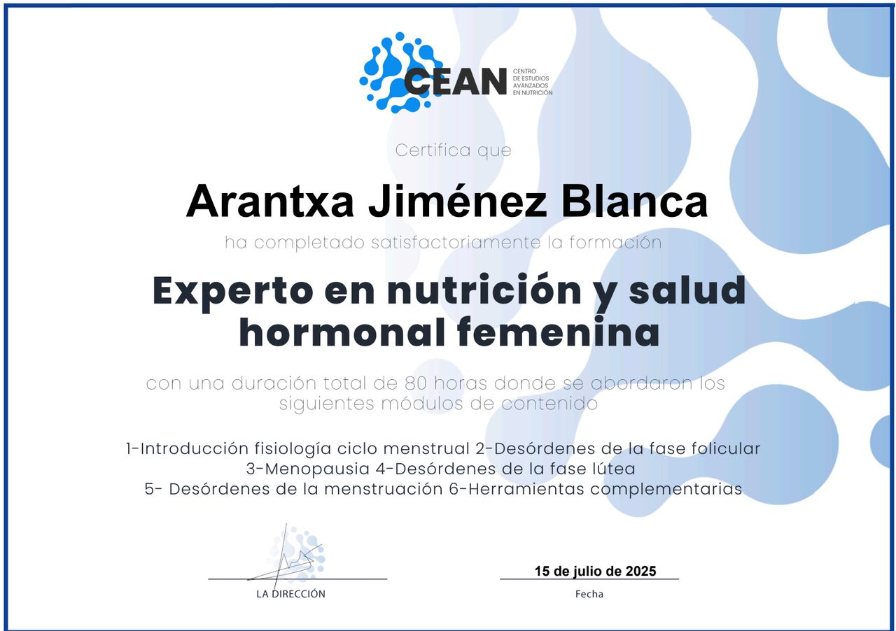 Mi nombre es Arantxa Jiménez y soy Dietista-Nutricionista. Trabajo a través de un enfoque integral patologias asociadas a la Salud Hormonal, Trastornos de la Conducta Alimentaria y Salud Digestiva.
