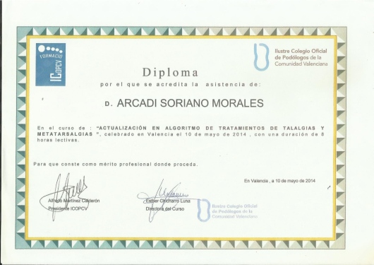 ¿Cuáles son las principales especialidades de Arcadi Soriano Morales?Arcadi Soriano Morales es podólogo, podólogo infantil. Te mostramos algunos de los servicios que ofrece gracias a su trayectoria y amplia experiencia: Quiropodia, Exploración biomecánica, Valoración preoperatoria.