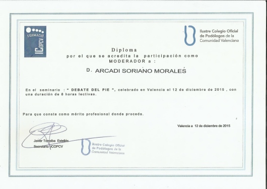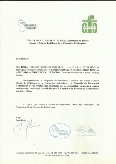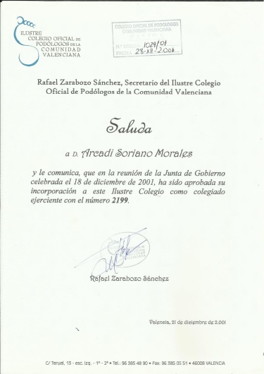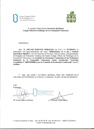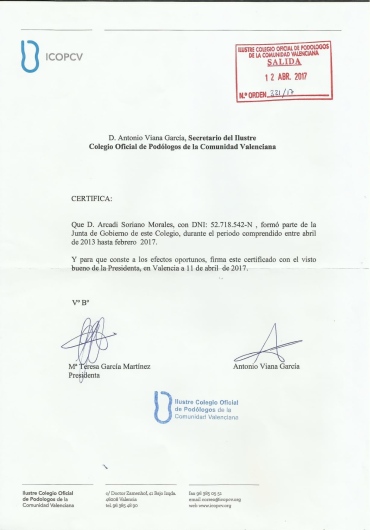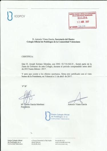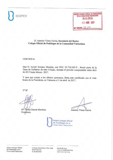 Ha sido miembro de la junta de gobierno del colegio de podólogos de Valencia.