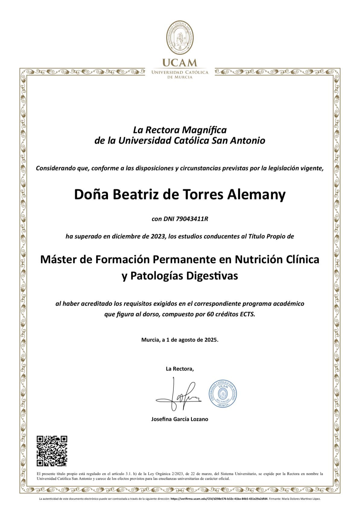 ¿Cuáles son las principales especialidades de Beatriz De Torres Alemany?Beatriz De Torres Alemany es dietista nutricionista. Te mostramos algunos de los servicios que ofrece gracias a su trayectoria y amplia experiencia: Visita Medicina Complementaria y terapias alternativas, Visita Medicina Interna, Consulta de pacientes con dolor crónico, Consulta nutricional, Visita preoperatoria, Dieta en sobrepeso u obesidad, Consulta online.