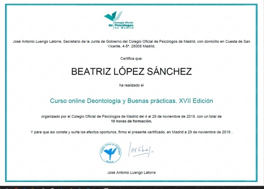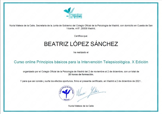 Beatriz es una profesional con la que te sientes totalmente arropada. Es una persona que sabe, no solo escuchar si no dar justo con lo que necesitas. Tanto yo, las veces que he ido, como mi hijo que es mucho más joven que yo, estamos encantados. Su dedicación es total. La consulta es muy agradable y tiene todo lo que puedas necesitar y más. Es una psicóloga como pocas he encontrado. Gracias Beatriz