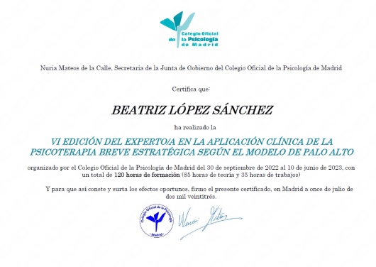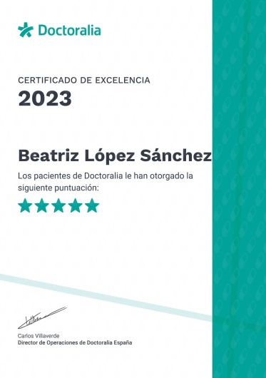 ¿Puedo hacer la visita con Beatriz López Sánchez de forma online, sin tener que desplazarme hasta su consulta?Sí, Beatriz López Sánchez ofrece consulta de forma remota. Solo tienes que seleccionar "consulta online" cuando vayas a reservar cita desde el calendario, y así podrás ver las fechas y horas disponibles.