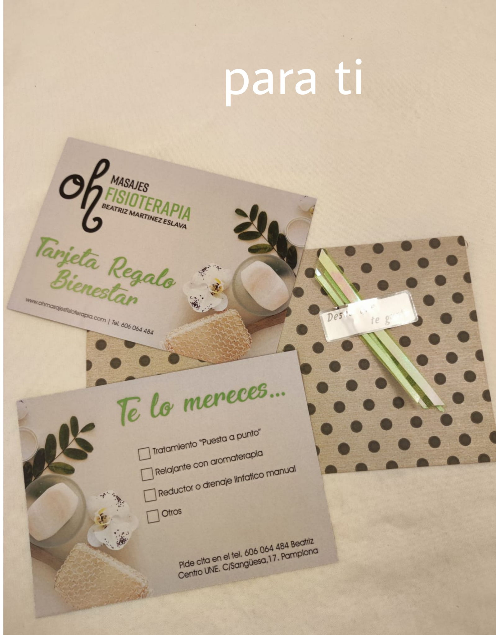 Tarjeta Regalo, para ti o para regalar. Porque tú lo vales¡¡ elige entre un masaje relajante o un puesta a punto.
