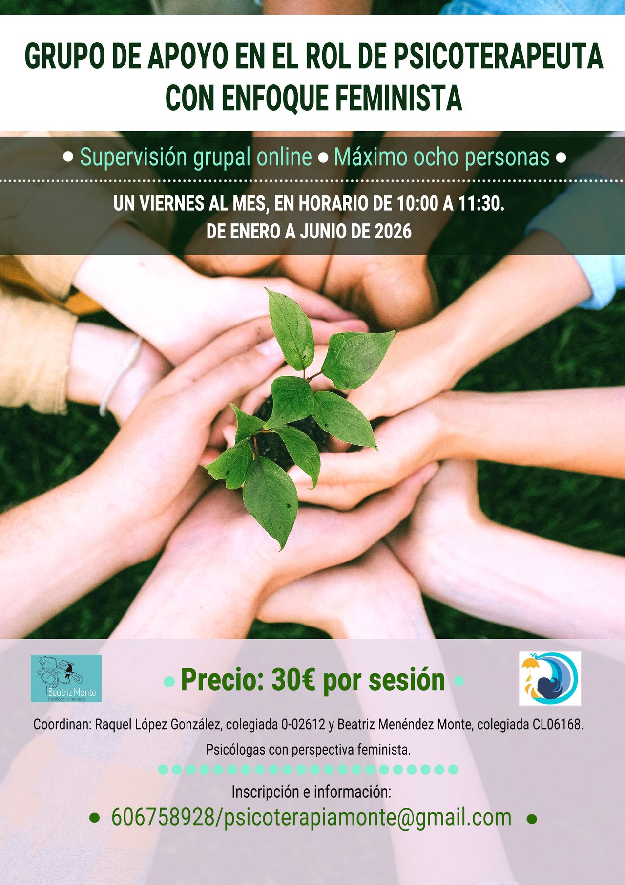 Ponemos en marcha este grupo online para psicoterapeutas, en el que poder compartir experiencias y darnos el apoyo necesario ante las dificultades que tantas veces surgen en nuestra práctica. Teniendo en cuenta cómo la socialización de género nos influye también en nuestro rol profesional y en la relación terapéutica, proponemos temas como el manejo de las rupturas del encuadre, situaciones complicadas que pueden surgir en la consulta, formas de cuidarnos en nuestra profesión, manejo de los tiempos...y todos aquellos que puedan ser de interés para las personas participantes. Os animamos a formar parte de este proyecto que creamos con tanta ilusión. ¡Bienvenidxs!
