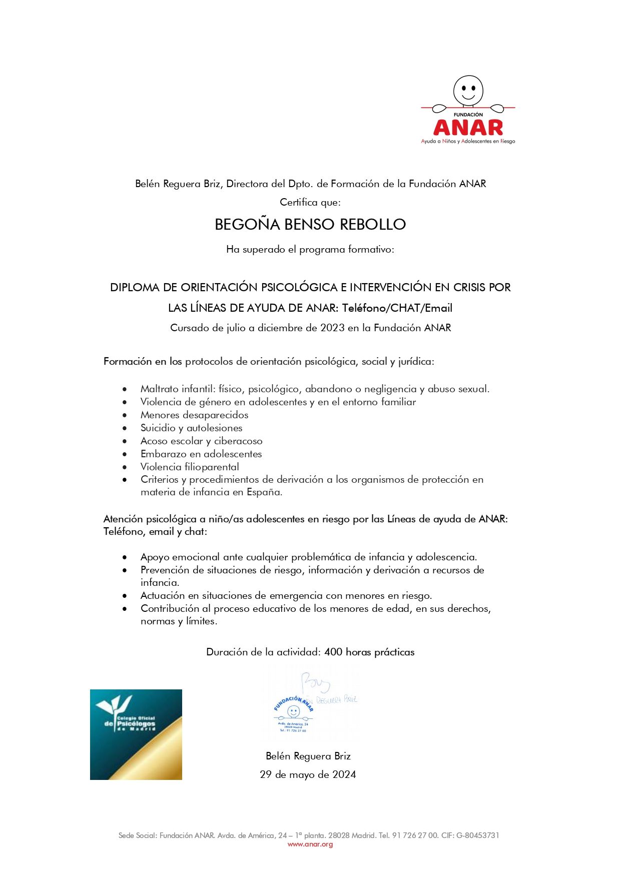 ¿Puedo hacer la visita con Begoña Benso Rebollo de forma online, sin tener que desplazarme hasta su consulta?Sí, Begoña Benso Rebollo ofrece consulta de forma remota. Solo tienes que seleccionar "consulta online" cuando vayas a reservar cita desde el calendario, y así podrás ver las fechas y horas disponibles.