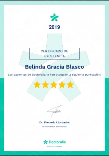¿Qué opinan los pacientes de Belinda Gracia Blasco?Un total de 115 pacientes han querido dejar una opinión sincera y real sobre Belinda Gracia Blasco, otorgándole además una valoración media de 5 estrellas (sobre un máximo de 5).