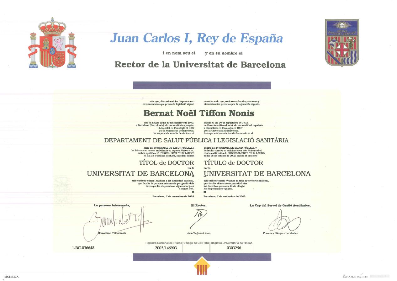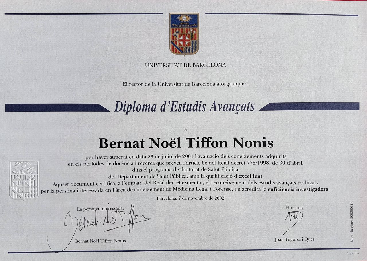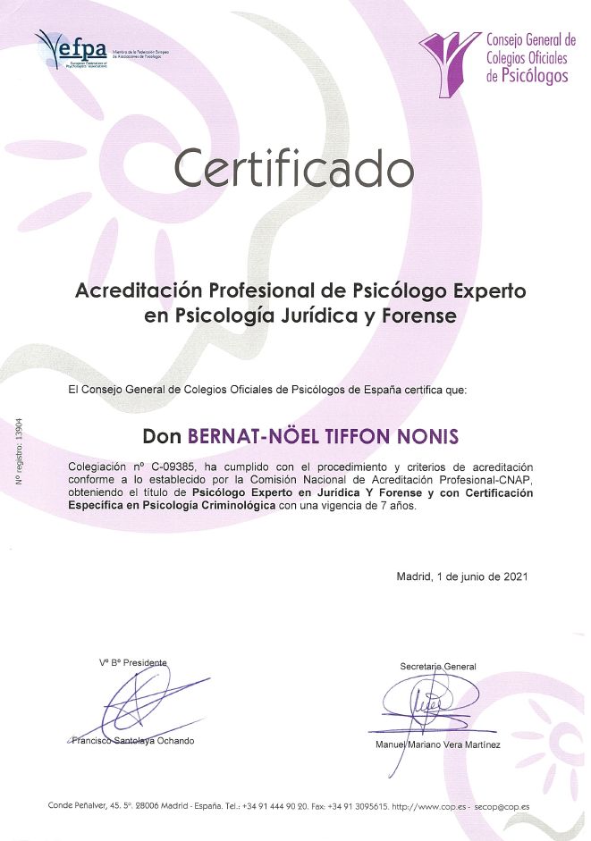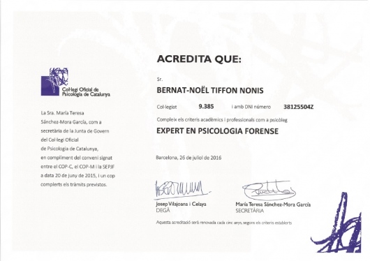 Soy Director y Fundador de CONSULTORIA EN PSICOLOGIA LEGAL Y FORENSE - Dr. Bernat-N. Tiffon (desde 1999).