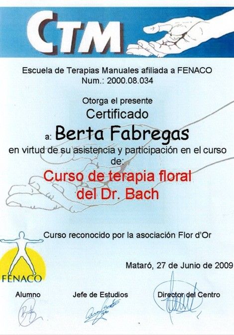 ¿Cuáles son las principales especialidades de Berta Fàbregas Julià?Berta Fàbregas Julià es terapeuta complementario. Te mostramos algunos de los servicios que ofrece gracias a su trayectoria y amplia experiencia: Visita Medicina Complementaria y terapias alternativas, Masaje facial japonés (Kobido), Sanaciones holísticas, Reiki, Masaje Holístico, Terapia con Flores de Bach, Terapia para ansiedad, Acompañamiento en el proceso personal, Terapia con muñecos, Terapia de desbloqueo emocional y energético.