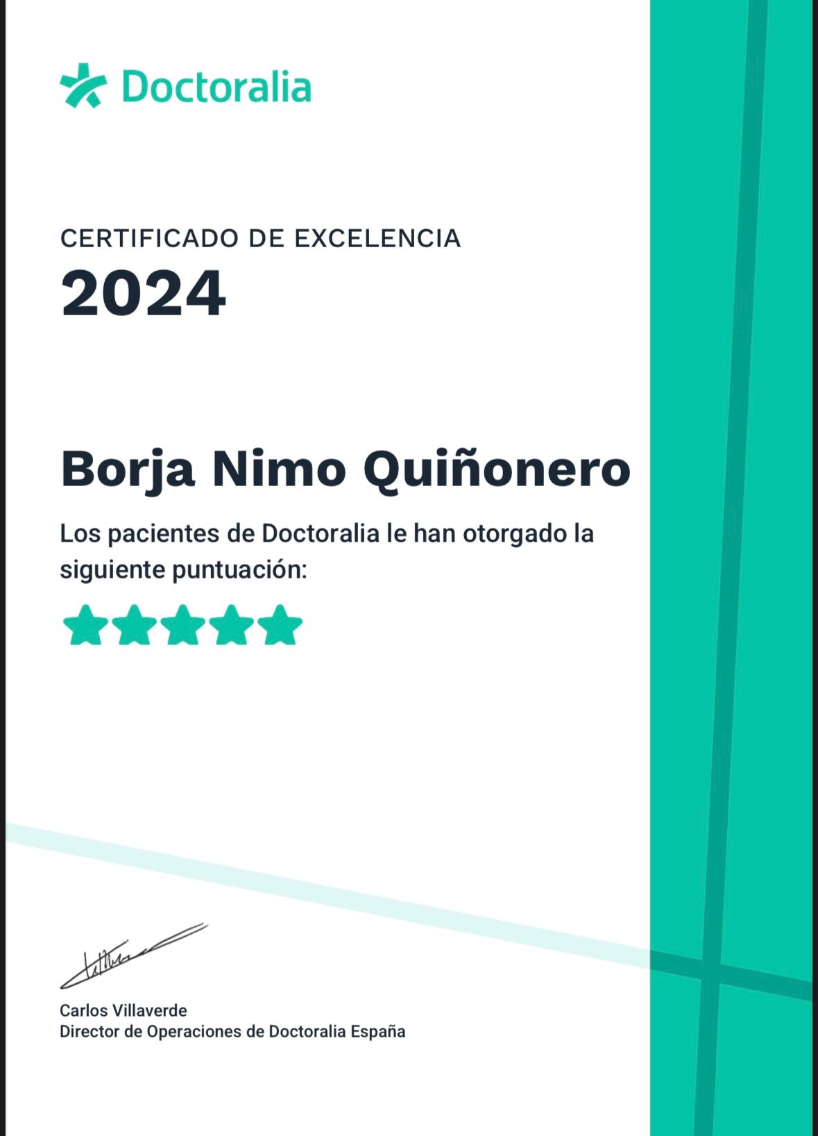 ¿Puedo hacer la visita con Borja Nimo Quiñonero de forma online, sin tener que desplazarme hasta su consulta?No, por el momento Borja Nimo Quiñonero no ofrece consulta online.