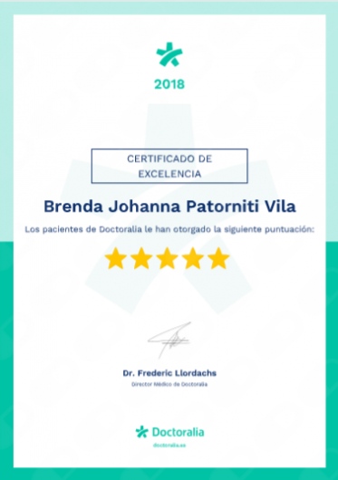 ¿Puedo hacer la visita con Brenda Johanna Patorniti Vila de forma online, sin tener que desplazarme hasta su consulta?No, por el momento Brenda Johanna Patorniti Vila no ofrece consulta online.