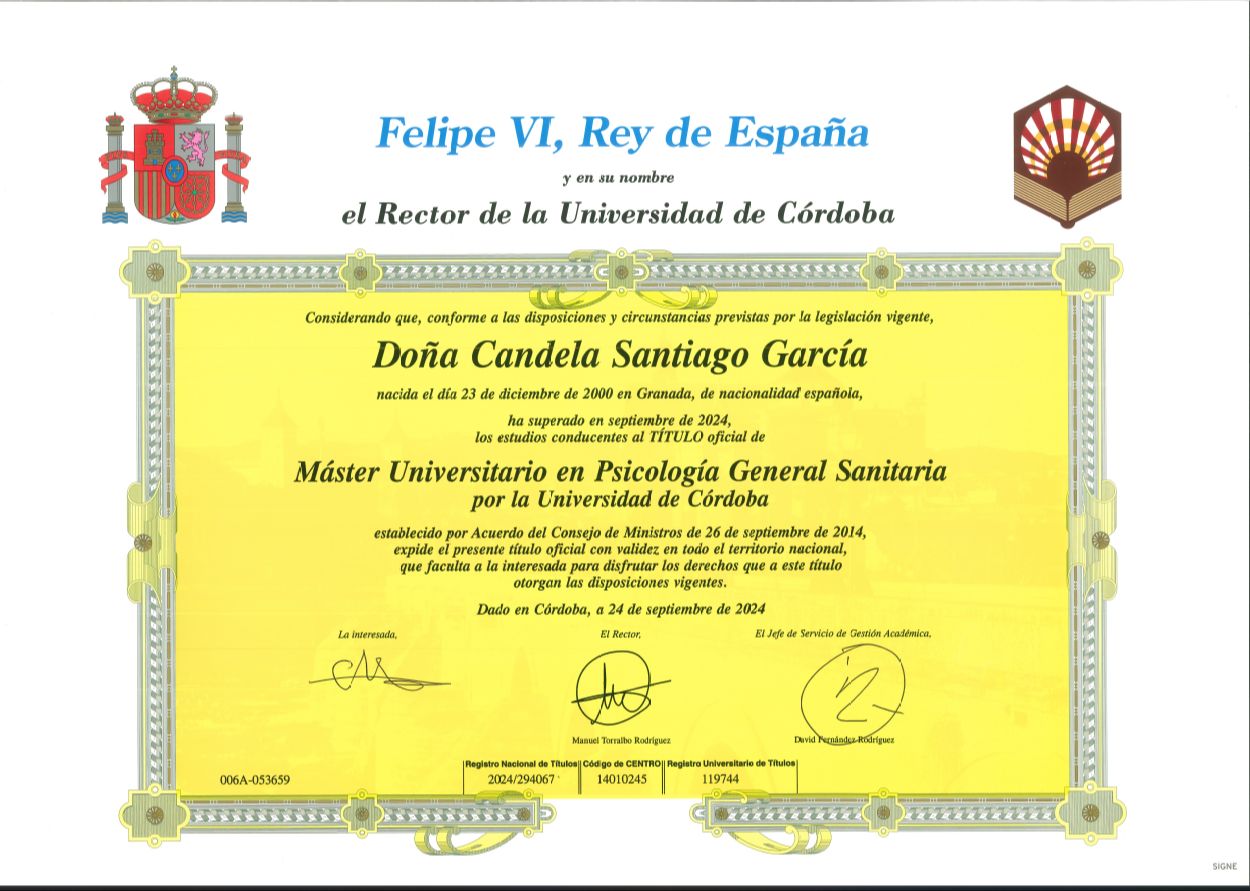 ¿Cuáles son las principales especialidades de Candela Santiago García?Candela Santiago García es psicóloga, psicóloga infantil. Te mostramos algunos de los servicios que ofrece gracias a su trayectoria y amplia experiencia: Consulta online, Primera visita Psicología, Visita Psicología, Primera visita Psicología Infantil, Primera Visita Psicopedagogía, Primera visita neuropsicología, Psicoterapia individual, Aceptación de la orientación sexoafectiva, Acompañamiento a los hijos en la separación/divorcio, Acompañamiento emocional para PAS (Personas Altamente Sensibles).