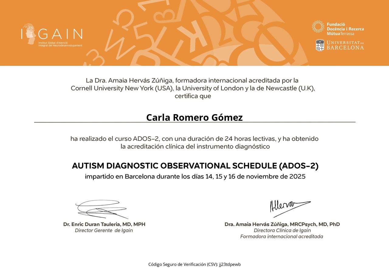 Soy Psicóloga General Sanitaria con formación de posgrado en Bienestar Social e Intervención Familiar, además de contar con el Máster en Psicología General Sanitaria. Estoy acreditada en la aplicación de la Escala de Observación para el Diagnóstico del Autismo (ADOS-2).