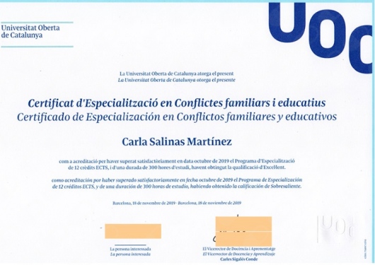 ¿Cuáles son las principales especialidades de Carla Salinas Martínez?Carla Salinas Martínez es psicopedagoga. Te mostramos algunos de los servicios que ofrece gracias a su trayectoria y amplia experiencia: Orientación en la crianza de los hijos, Orientación y asesoramiento psicopedagógico, Reeducación familiar, Reeducación psicopedagógica, Asesoramiento a padres, Técnicas de estudio (orientación profesional), Tratamiento para trastornos del aprendizaje, Mediación familiar, Resolución de problemas de padres- hijos, Estrategias terapéuticas en comunicación y habilidades sociales.