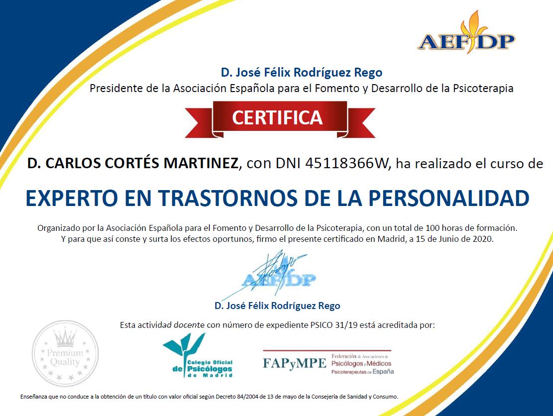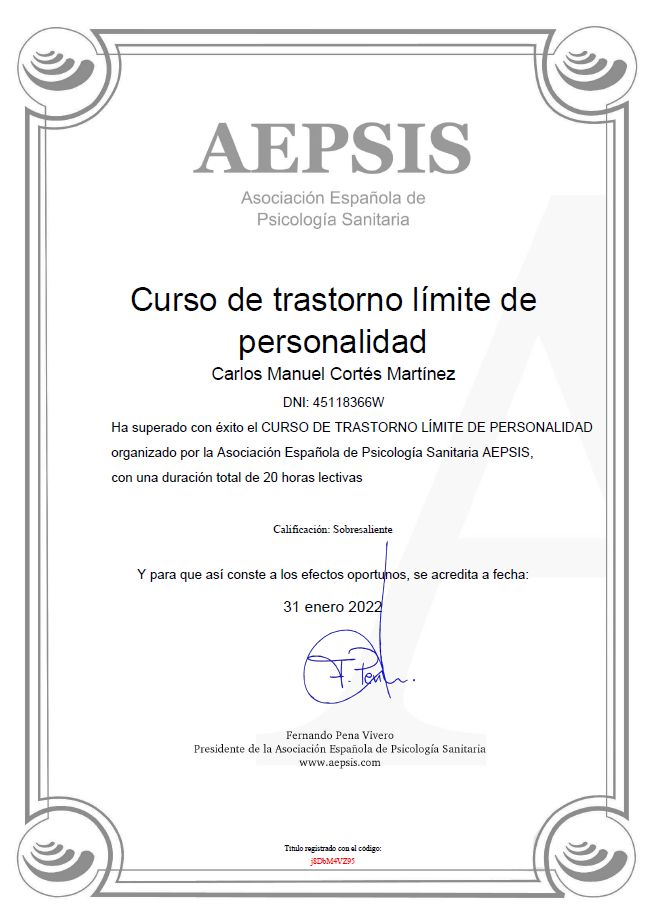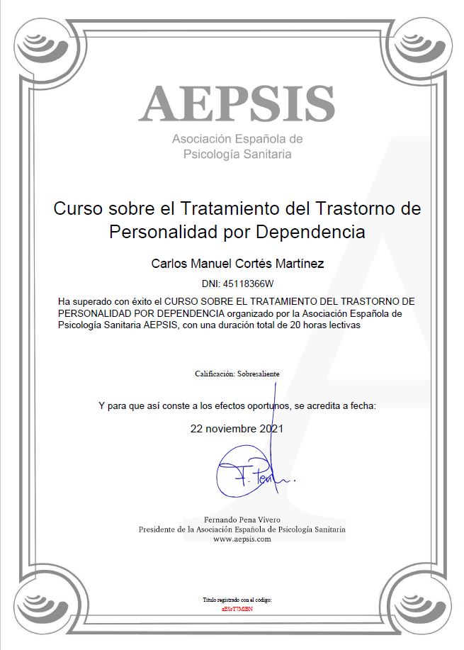 ¿Cuáles son las principales especialidades de Carlos Cortés Martínez?Carlos Cortés Martínez es psicólogo. Te mostramos algunos de los servicios que ofrece gracias a su trayectoria y amplia experiencia: Primera visita Psicología, Psicoterapia individual, Gestión de ansiedad ante los exámenes, Gestión de la ansiedad, Miedo a tomar decisiones, Entrenamiento en relajación, Entrenamiento de mindfulness, Diagnóstico y tratamiento para la depresión, Evaluación, diagnóstico y tratamiento del trastorno de pánico (con o sin agorafobia), Acompañamiento emocional.