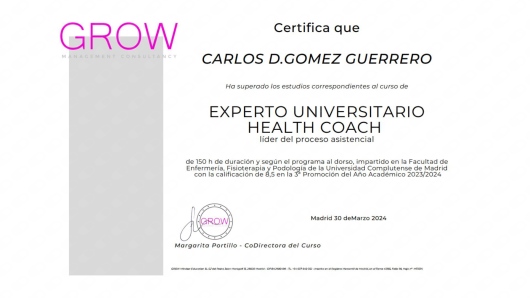 Health Coach (coach sanitario), certificado por la universidad Complutense de Madrid. Trabajo en un equipo multidisciplinar de médicos reumatólogos, traumatólogos, psiquiatras y nutricionistas.