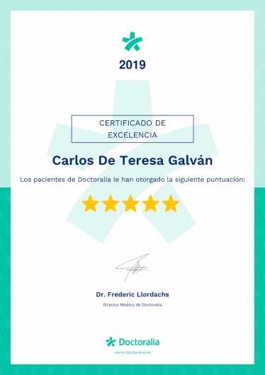 ¿Qué opinan los pacientes de Carlos De Teresa Galván?Un total de 112 pacientes han querido dejar una opinión sincera y real sobre Carlos De Teresa Galván, otorgándole además una valoración media de 5 estrellas (sobre un máximo de 5).