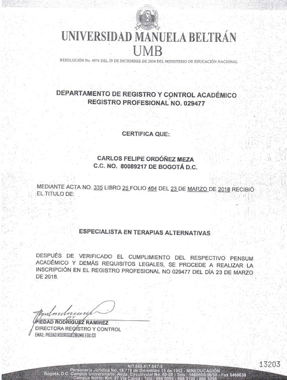 ¿Cuáles son las principales especialidades de Carlos Felipe Ordoñez Meza?Carlos Felipe Ordoñez Meza es terapeuta complementario. Te mostramos algunos de los servicios que ofrece gracias a su trayectoria y amplia experiencia: Consulta online, Visita Medicina Complementaria y terapias alternativas, Acupuntura.
