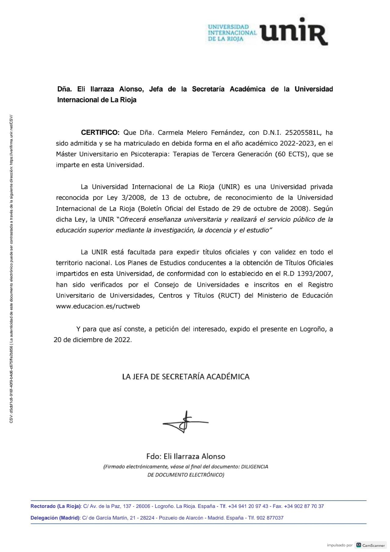 ¿Cuáles son las principales especialidades de Carmela Melero Fernández?Carmela Melero Fernández es psicóloga. Te mostramos algunos de los servicios que ofrece gracias a su trayectoria y amplia experiencia: Primera visita Psicología, Consulta de Psicología Sanitaria, Consulta online, Terapia online, Tratamiento depresión (sesiones online), Tratamiento para la depresión (teleconsulta online), Tratamiento en problemas de ansiedad y estrés (sesiones online), Tratamiento en autoestima (sesiones online), Tratamiento online de problemas de ansiedad, Consulta psicológica online.