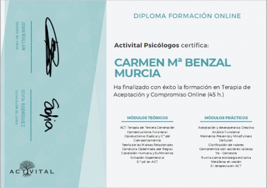 ¿Cuáles son las principales especialidades de Carmen Maria Benzal Murcia?Carmen Maria Benzal Murcia es psicólogo, psicólogo infantil. Te mostramos algunos de los servicios que ofrece gracias a su trayectoria y amplia experiencia: Primera visita Psicología, Estrategias terapéuticas en comunicación y habilidades sociales, Técnicas y estrategias de autoestima, Estimulación cognitiva, Relajación, Programa de Inteligencia Emocional, Psicología infantil, Consulta online.