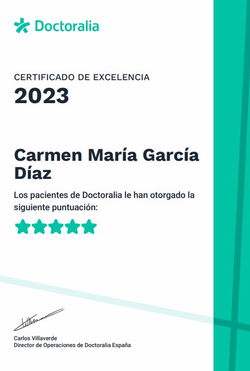 ¿Para cuándo podría visitarme con Carmen María García Díaz?A veces Carmen María García Díaz tiene algunas horas disponibles dentro de la misma semana o para la siguiente. Consulta su calendario: verás la primera hora que tiene disponible, ya que se actualiza en tiempo real. Si no te va bien esa primera hora, comprueba otros días. La reserva siempre es inmediata y gratuita.