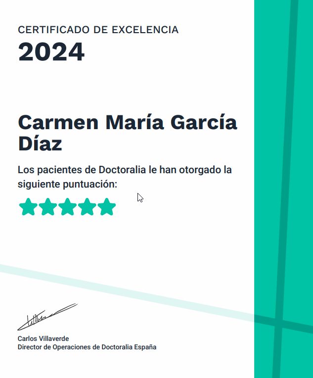 ¿Cómo puedo reservar una cita con Carmen María García Díaz?El calendario que muestra Carmen María García Díaz en Doctoralia está actualizado en tiempo real, por lo que solo tienes que elegir qué día y hora te va mejor de entre las disponibles. La reserva es gratuita, y además recibes un recordatorio antes de la visita.