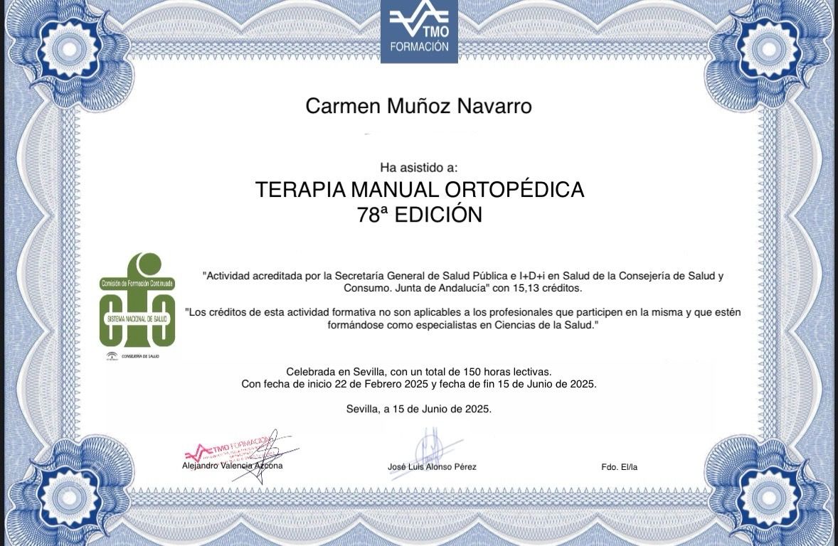 ¿Cuáles son las principales especialidades de Carmen Muñoz Navarro?Carmen Muñoz Navarro es fisioterapeuta. Te mostramos algunos de los servicios que ofrece gracias a su trayectoria y amplia experiencia: Visita Fisioterapia, Fisioterapia Dermatofuncional, Ejercicio terapéutico, Punción seca, Tecarterapia, Tratamiento para cervicalgia, Tratamiento para lumbalgia, Fisioterapia y Neuromodulación, Esguinces, Fisioterapia reumatológica (Artrosis, artritis, osteoporosis...).