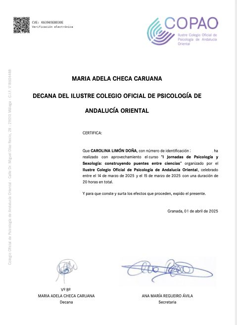 Me gradué en Psicología por la Universidad de Sevilla en 2023 y, tras ello, viví un año en Galway (Irlanda), una experiencia que supuso un gran crecimiento personal y profesional y me permitió mejorar mi nivel de inglés. Durante ese tiempo continué formándome activamente.